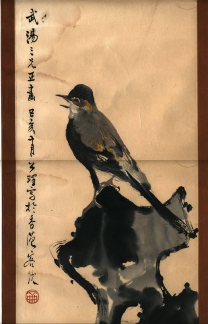 Bird and Flower Painting Scroll by Famous Hong Kong Artist Zhou Gong-li (1903-1990)